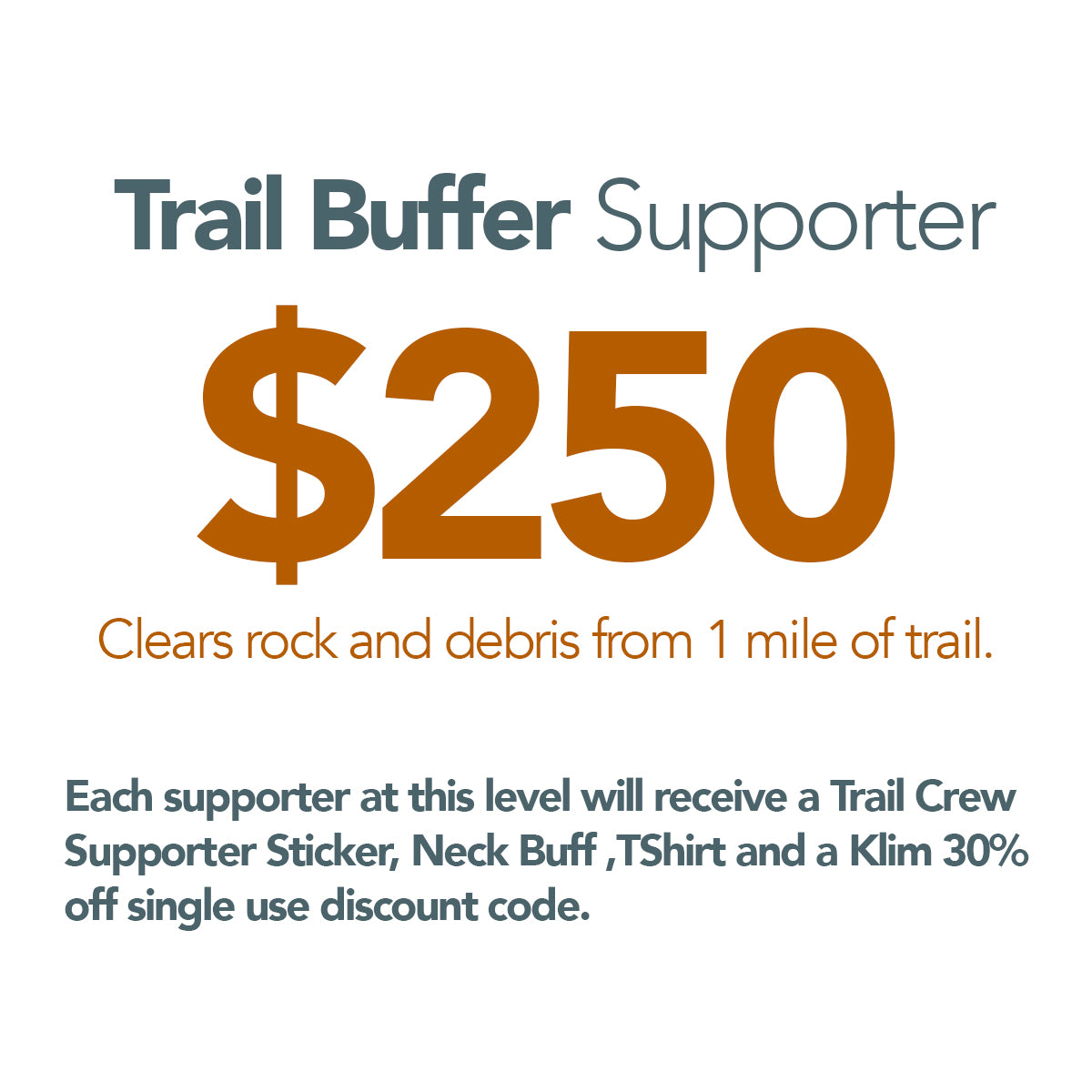 Each supporter at this level will receive a Trail Crew Supporter Sticker, Neck Buff, T-Shirt and a Klim 30% off single use discount code.